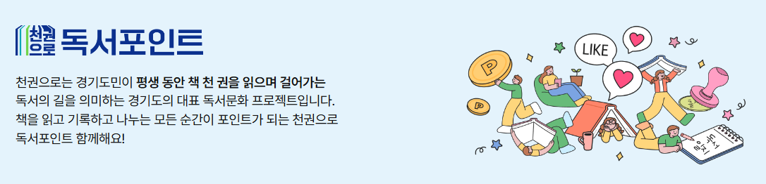 ‘천권으로 독서포인트제’는 경기도가 주관하는 독서 장려 프로그램으로, 도민이 책을 읽고 인증하면 포인트를 적립해 지역서점에서 실제 사용할 수 있는 지역화폐로 자동 전환되는 시스템입니다.