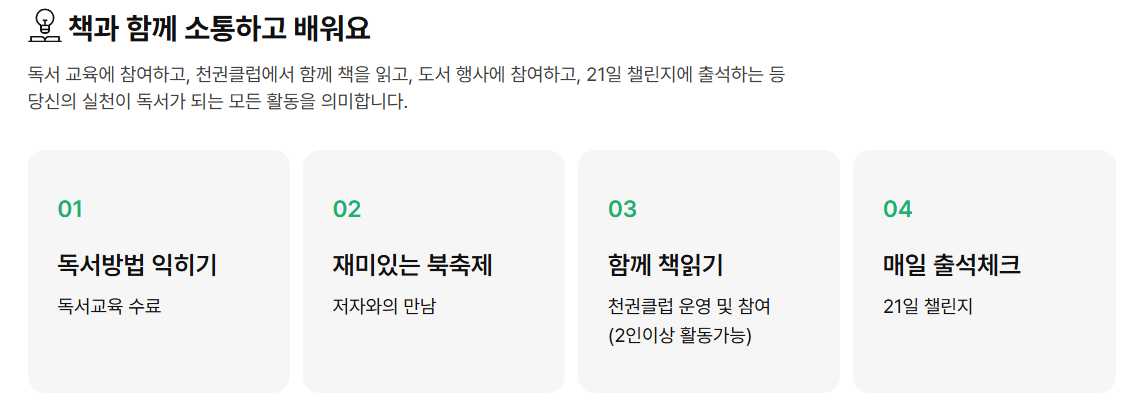 - 천권클럽 활동: 독서동아리 참여, 도서 행사 출석 등