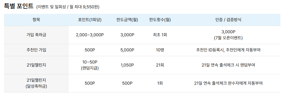 - 21일 챌린지 출석: 매일 출석체크로 랜덤 포인트 적립