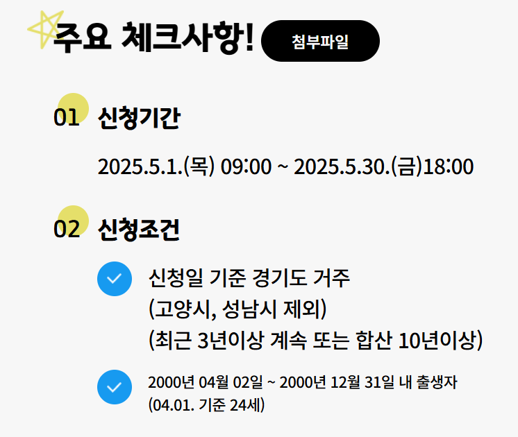 신청일 기준 경기도에 주민등록을 두고 있는 24세 청년 중 3년 이상 계속 또는 합산 10년 이상 거주한 경우