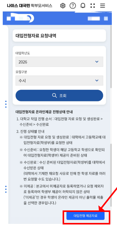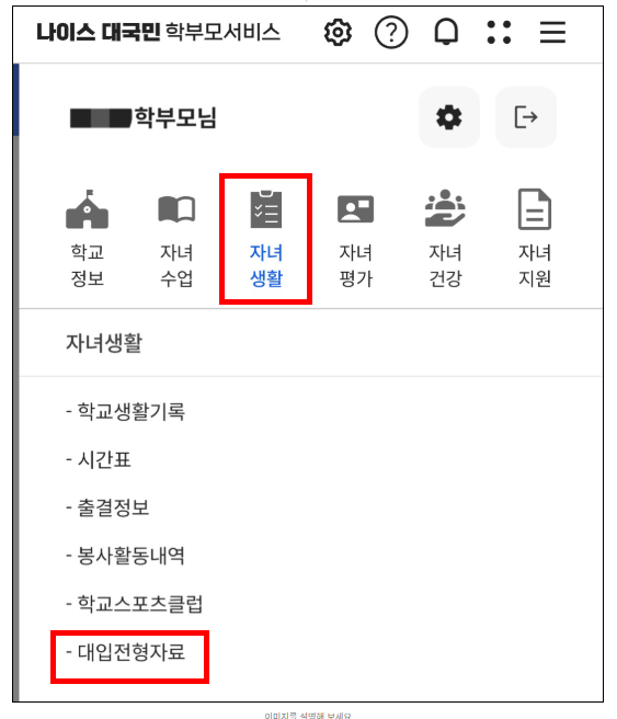 | 5단계 | 생활기록부 열람: 성적, 출결, 봉사, 수상, 진로활동 등 확인 |