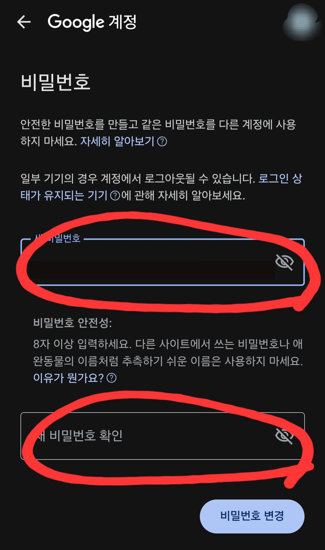 (5) 8자 이상의 '새 비밀번호'로 변경