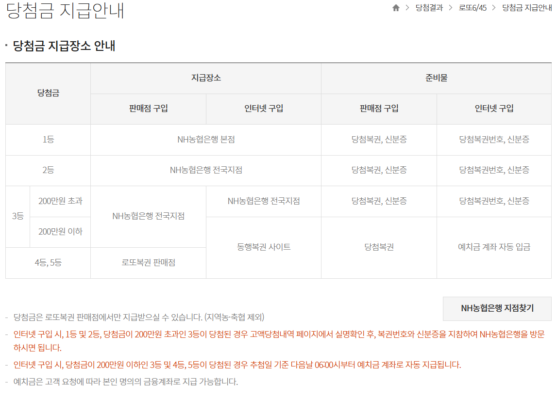 | 4등 | 오프라인 구매 시: 판매점 / 온라인 구매 시: 예치금 자동 입금 | 판매점 방문 또는 예치금 입금 | ❌ |