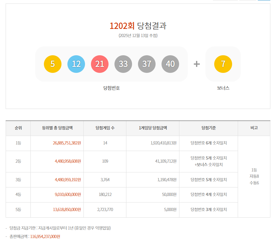 로또 6/45를 사면서 “진짜 당첨되는 사람 있을까?” 싶었는데 이번 1202회차(2025년 12월 13일 추첨)에서 직접 자동으로 발행한 복권으로 숫자 4개가 일치하여 로또 4등에 당첨됐습니다!
