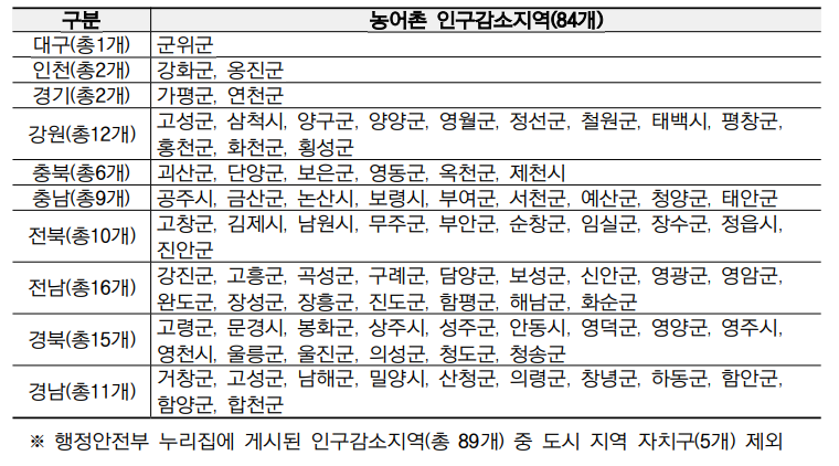○ 동시에, 민생회복 소비쿠폰이 지역 균형발전에도 기여할 수 있도록 비수도권(서울·경기·인천 제외) 주민은 3만원을, 농어촌 인구감소지역 (84개 시군) 주민은 5만원을 추가로 지급할 예정입니다.
