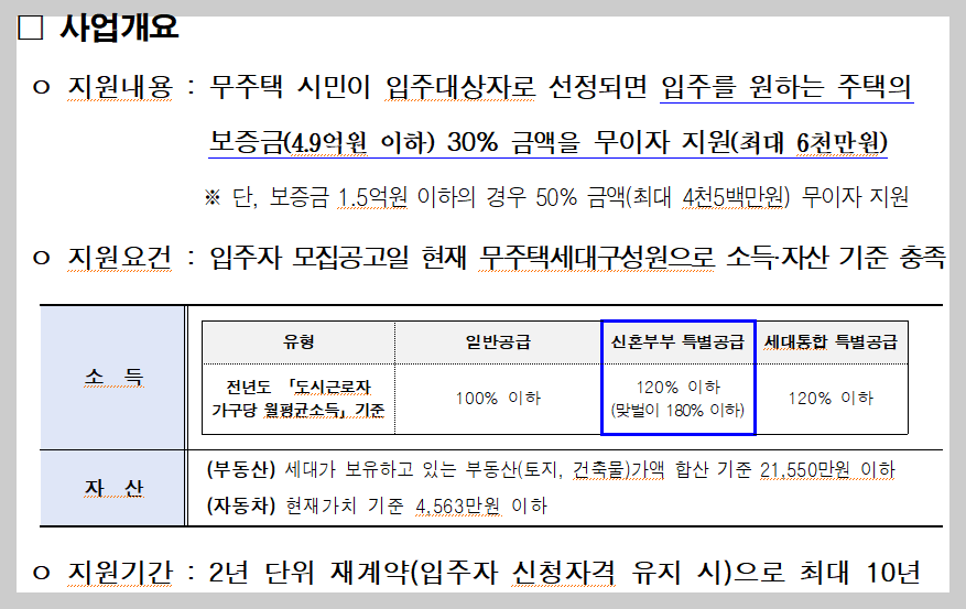 서울시가 운영하는 임차형 공공임대주택 제도로, 무주택자가 원하는 민간주택(보증금 4억 9천만원 이하)에 대해 보증금의 30% (최대 6,000만원)을 무이자로 최장 10년간 지원해줍니다.