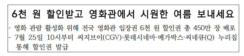 문화체육관광부와 영화진흥위원회가 2025년 7월 25일(금) 오전 10시부터 선착순 발급하는 6,000원 할인권 덕분에 최소 본인 부담금 1,000원으로 영화 관람이 가능합니다.