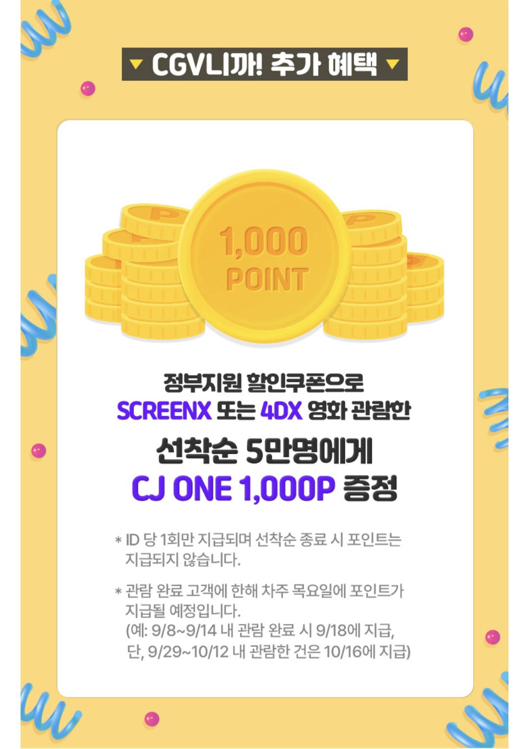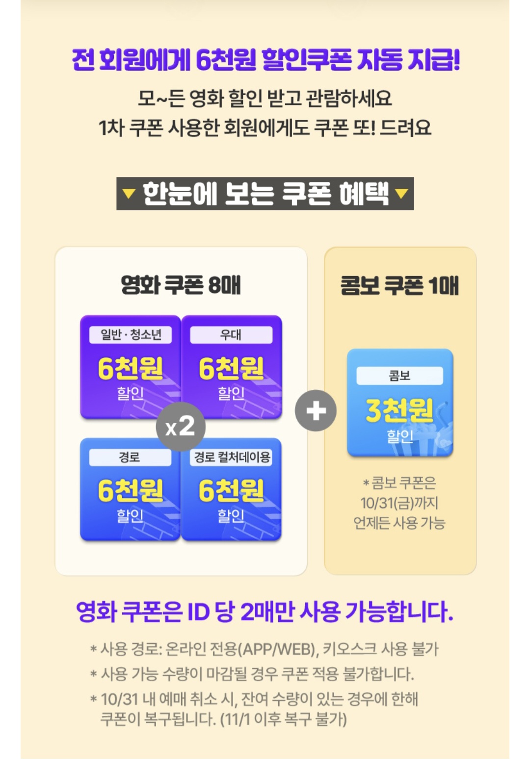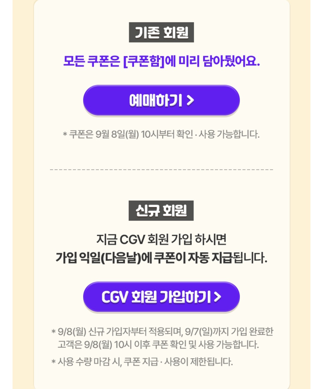 - 기존 회원: 9/8 오전 10시까지 영화쿠폰 9매 자동 지급