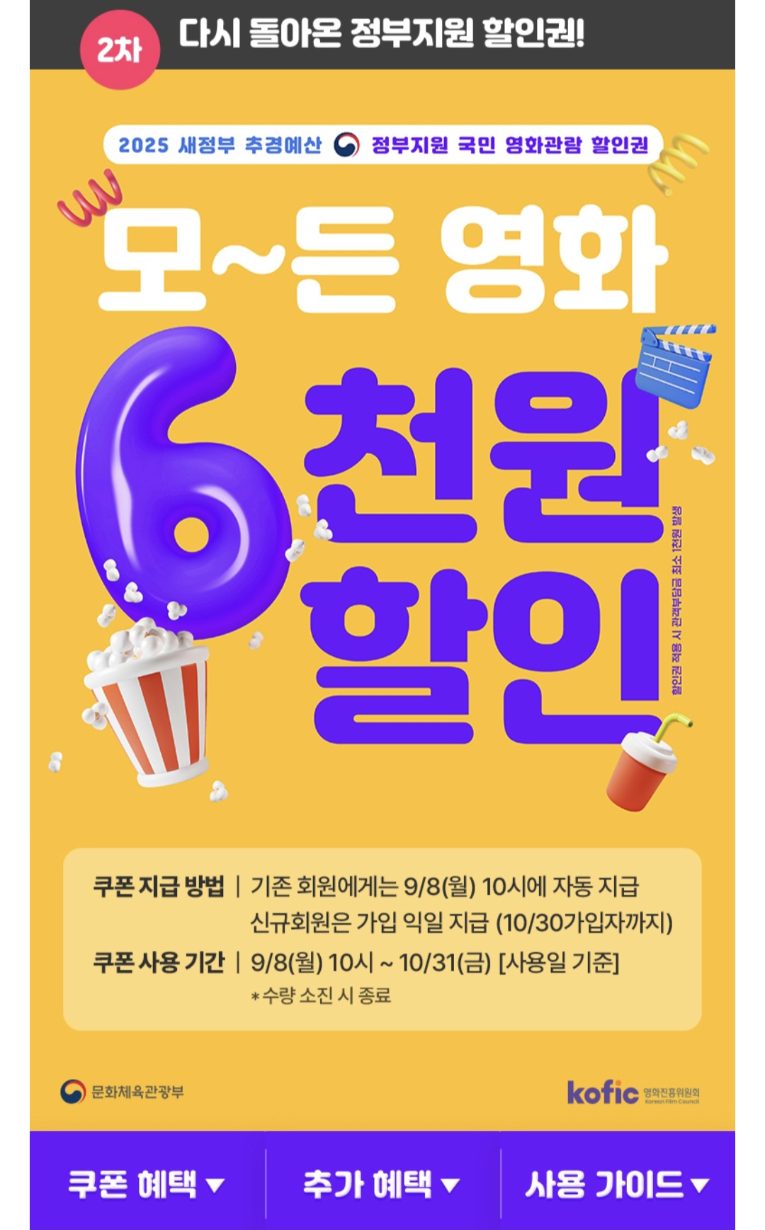 정부는 코로나19 이후 침체된 영화 산업을 되살리기 위해 2025년 9월 8일(월) 오전 10시부터 CGV 앱을 통해 영화 할인권 2차 지급을 시작했습니다.