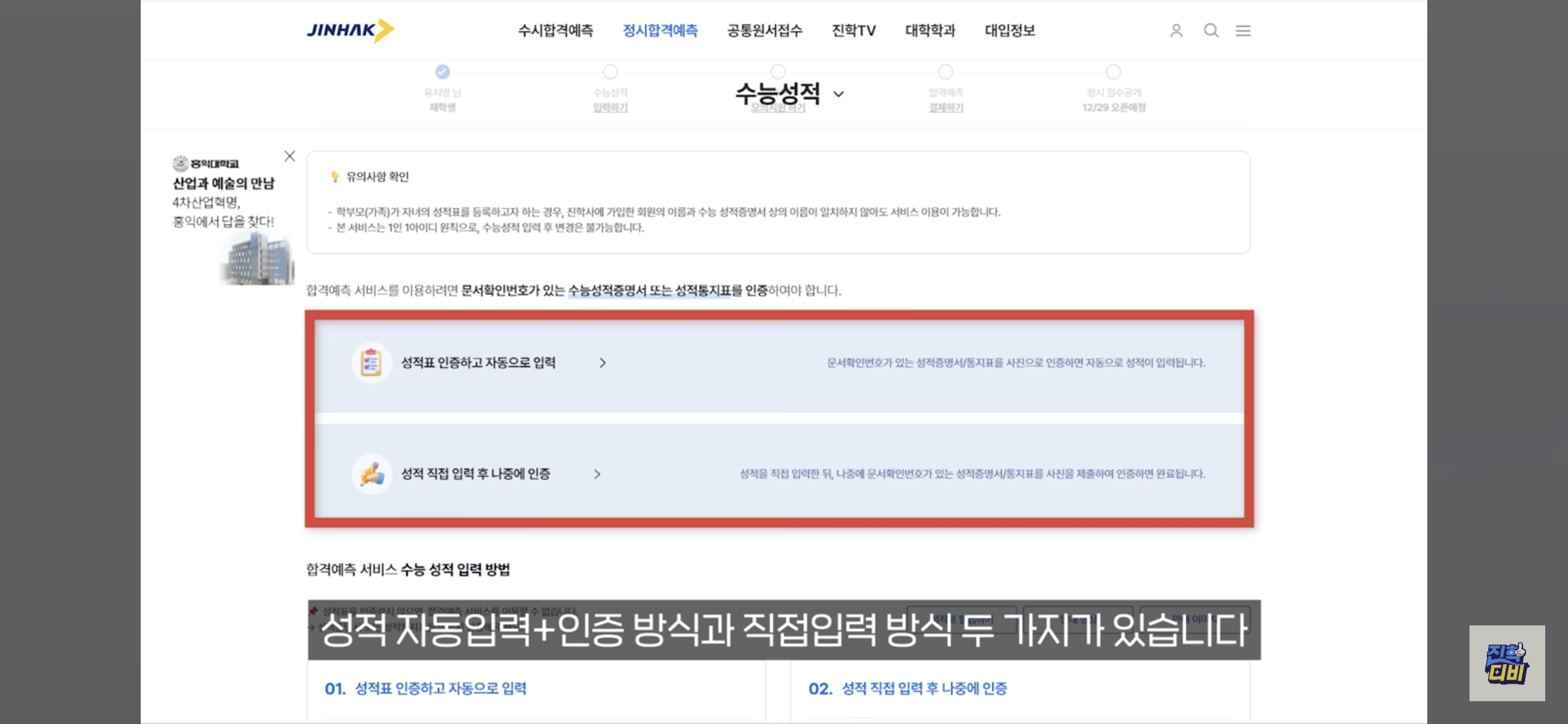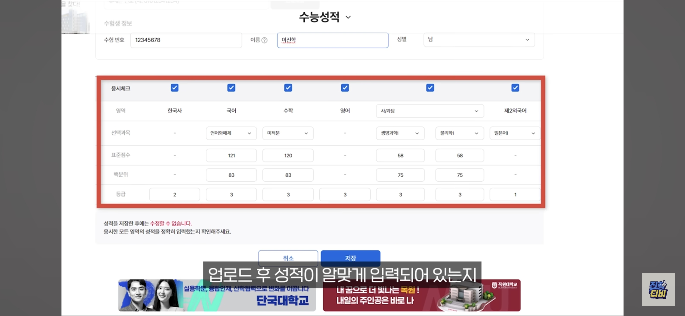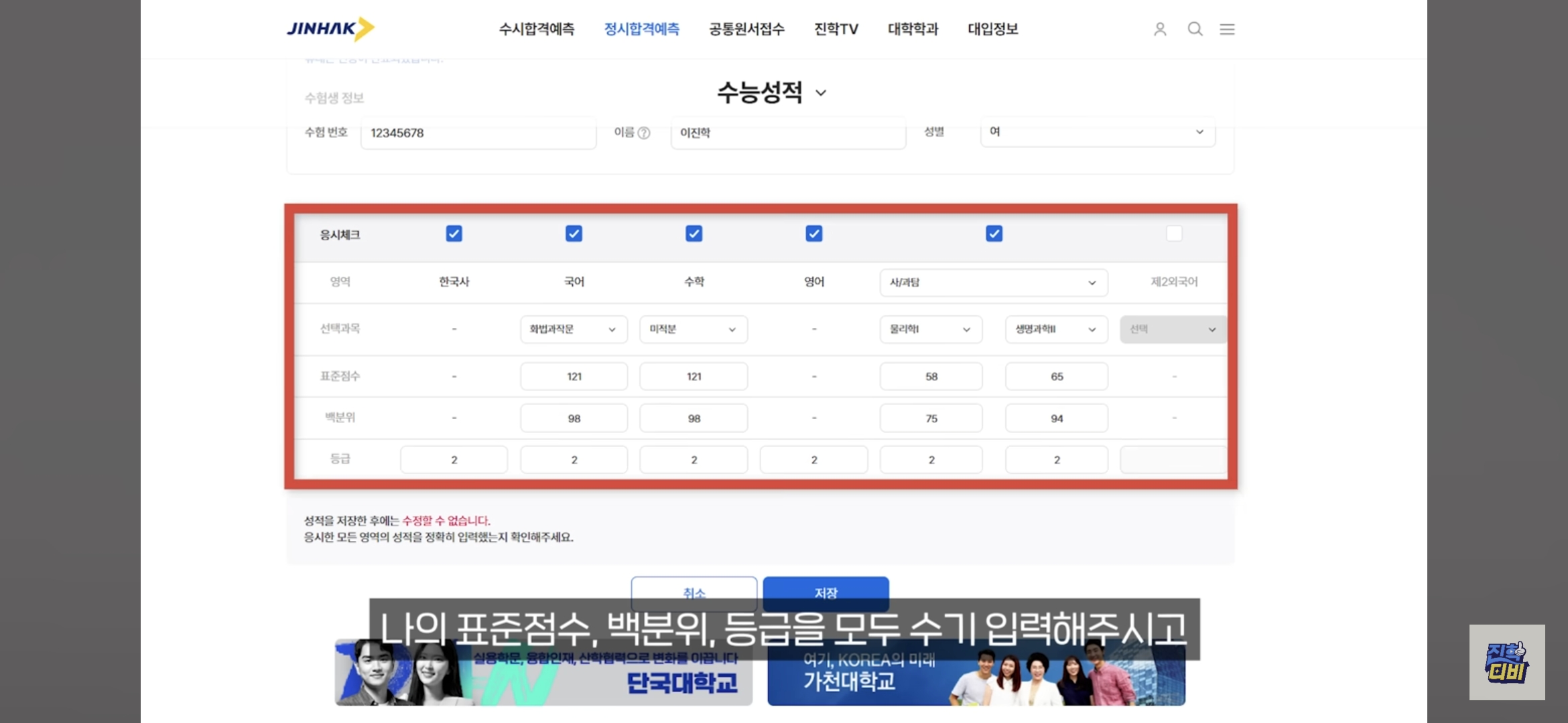 2. 수능 성적 입력 및 인증