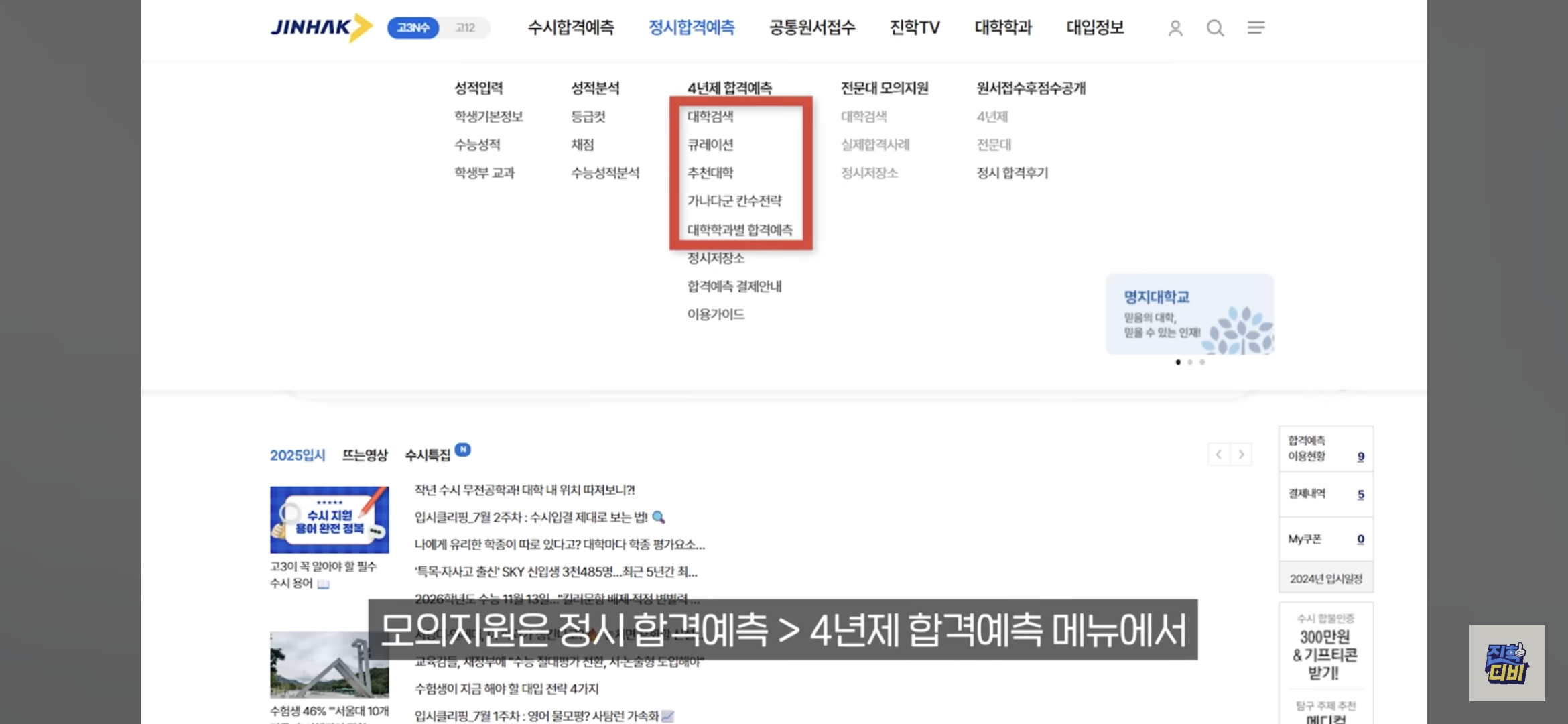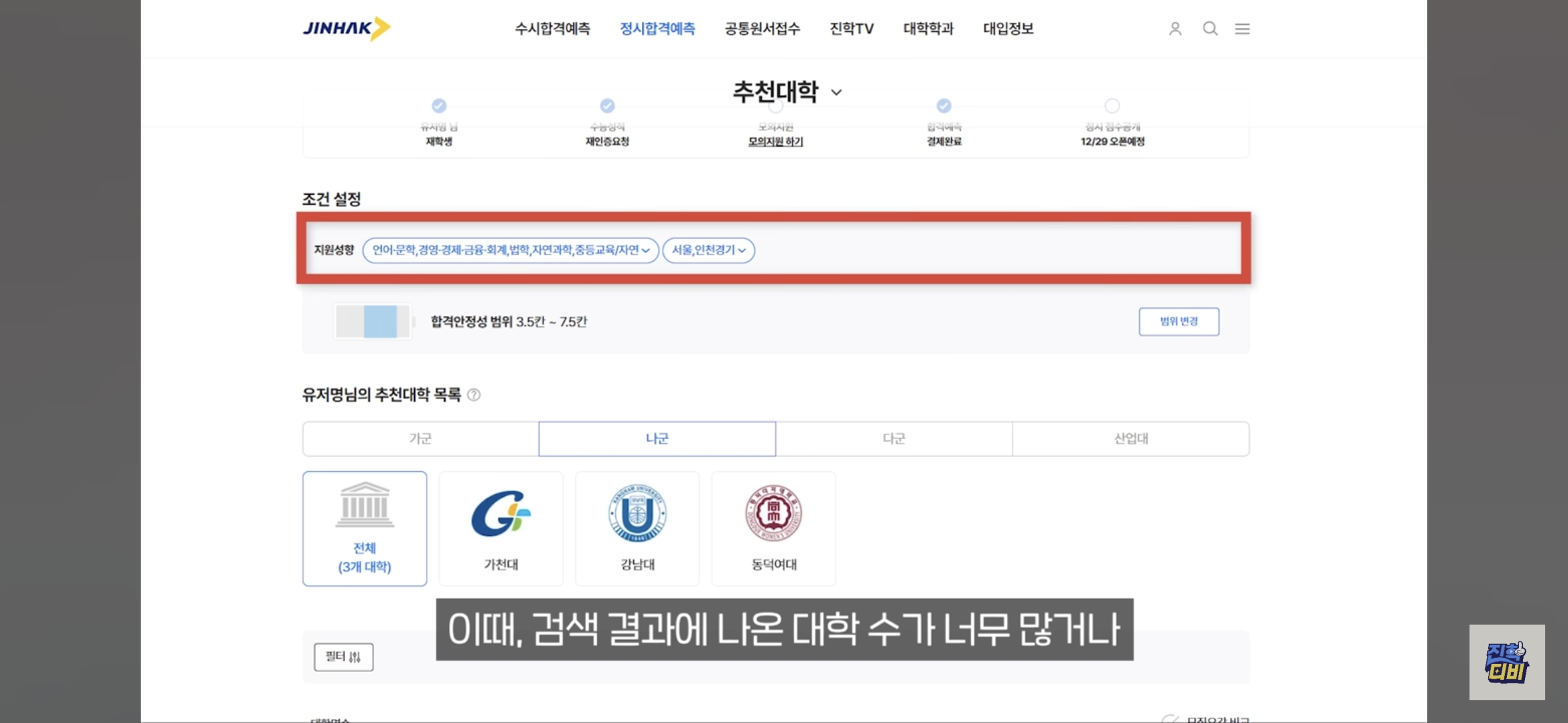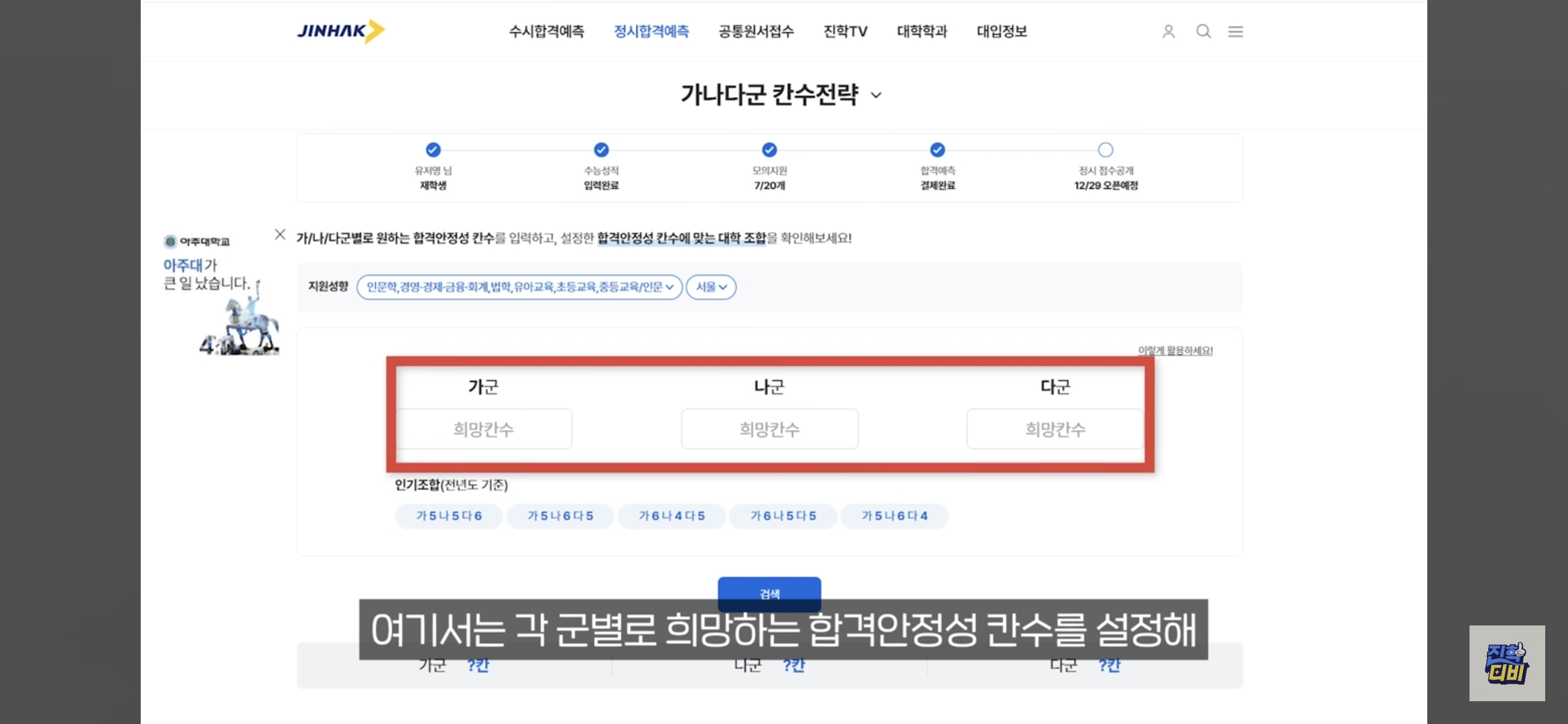 - 경로: 4년제 정시 합격예측 메뉴 → 대학 검색 or 추천 대학