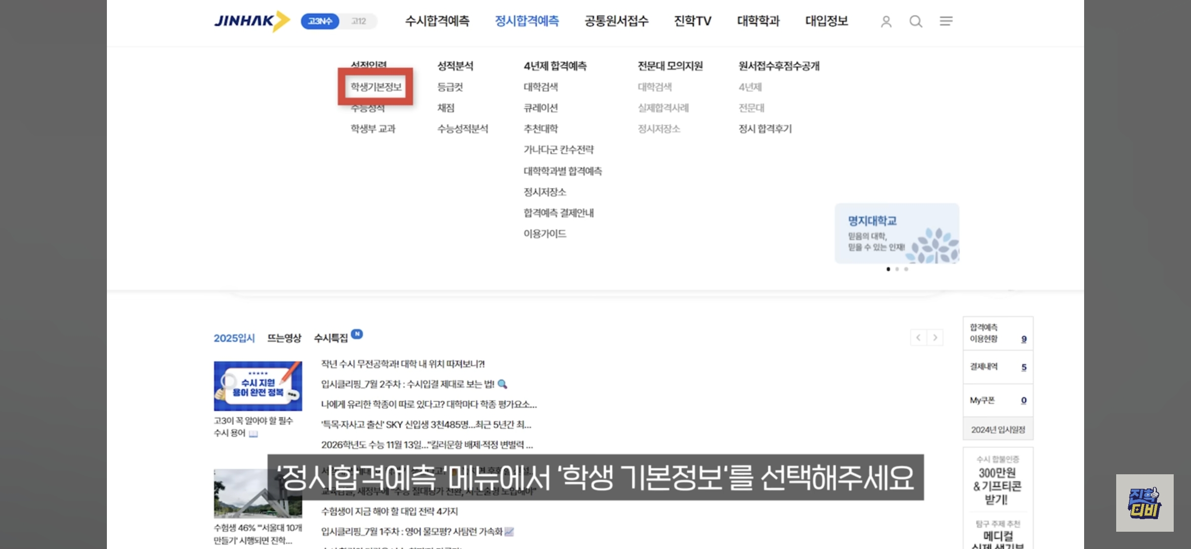 먼저, 진학사 정시 합격예측 메뉴에 들어가서 학생의 기본 정보를 입력해야 합니다.