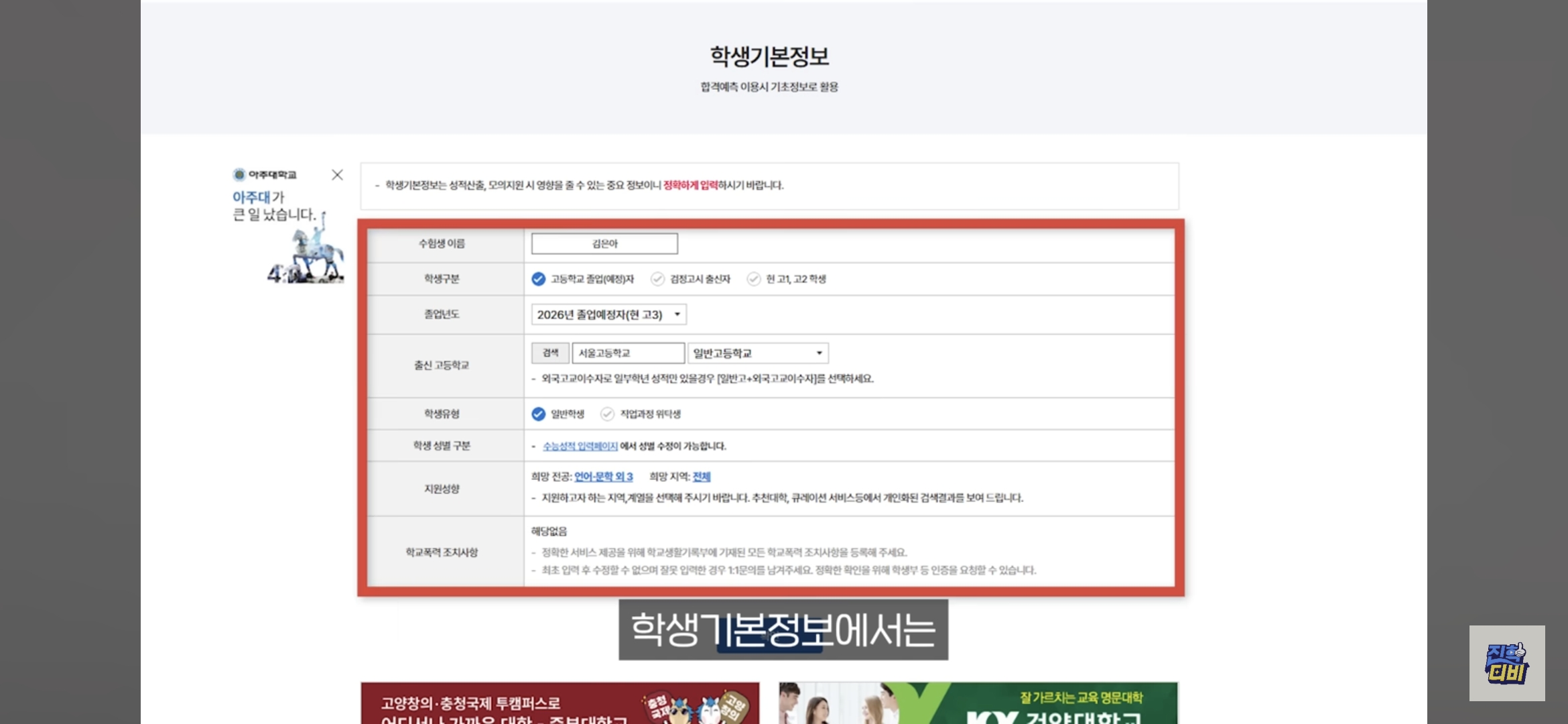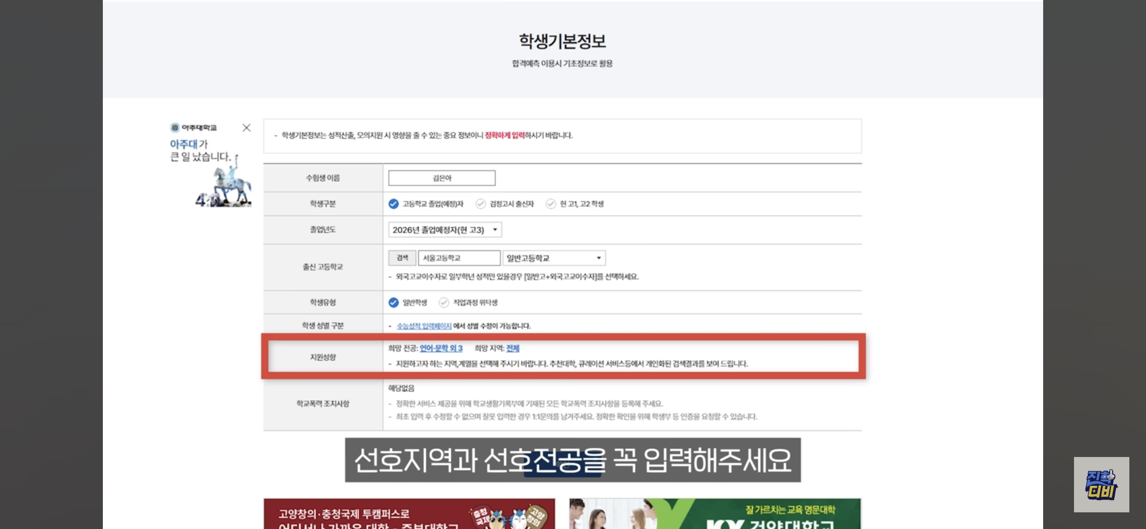 - 이름, 졸업 여부, 졸업연도, 출신 고교, 지원 성향 입력