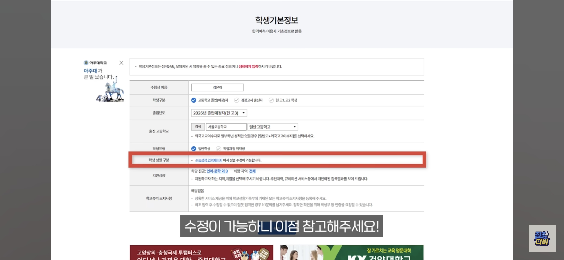 - 성별은 수능 성적 입력 단계에서만 수정 가능합니다.