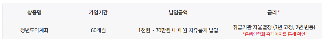 ※ 청년도약계좌는 정부기여금(공공재정지급금)이 지급되는 상품으로, 거짓된 정보로 부정청구를 하는 경우 「공공재정환수법」에 따라 정부기여금이 환수되며 제재부가금이 부과될 수 있습니다.