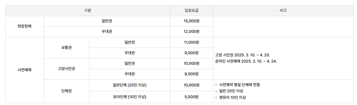 사전 예매는 네이버, 야놀자, 카카오톡 예약하기 등 온라인 플랫폼과 고양시청, 도서관 등 지정된 오프라인 판매처에서 가능합니다.