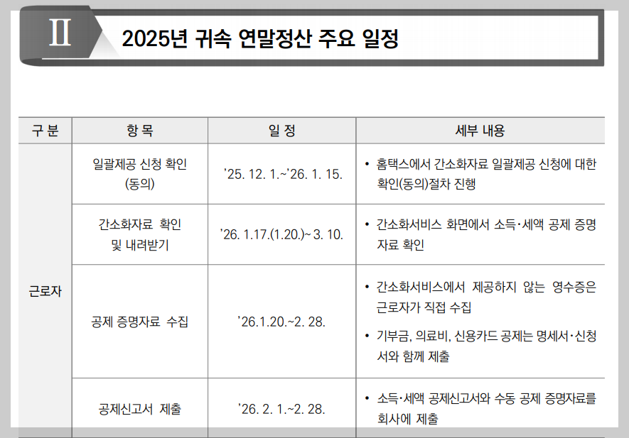 특히 국세청에서 제공하는 연말정산 간소화서비스는 일정이 정해져 있으며, 이 외에도 공제 증빙자료 제출, 원천세 신고, 서류 검토 등 절차별로 준비 기간이 다르기 때문에 미리 파악해두는 것이 중요합니다.