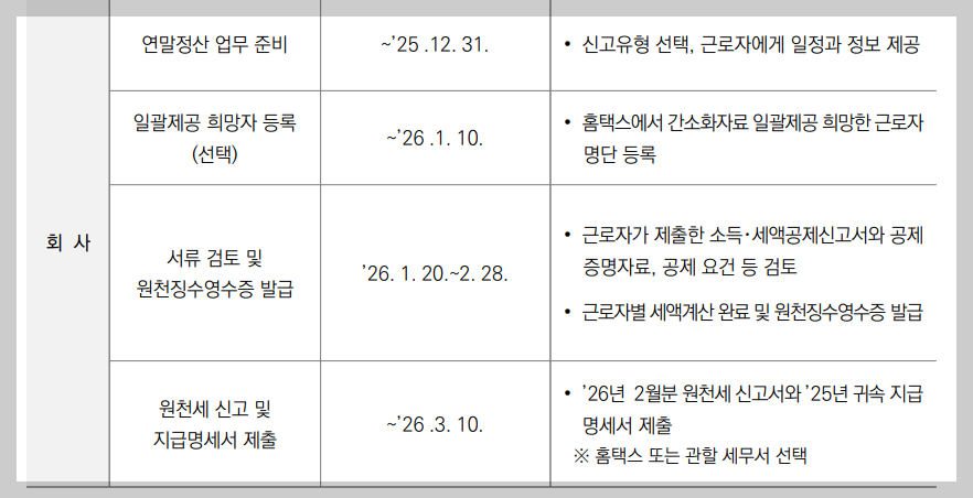 - 내용: 회사는 홈택스에서 신고 유형을 선택하고, 근로자들에게 연말정산 일정과 준비사항을 안내해야 합니다.