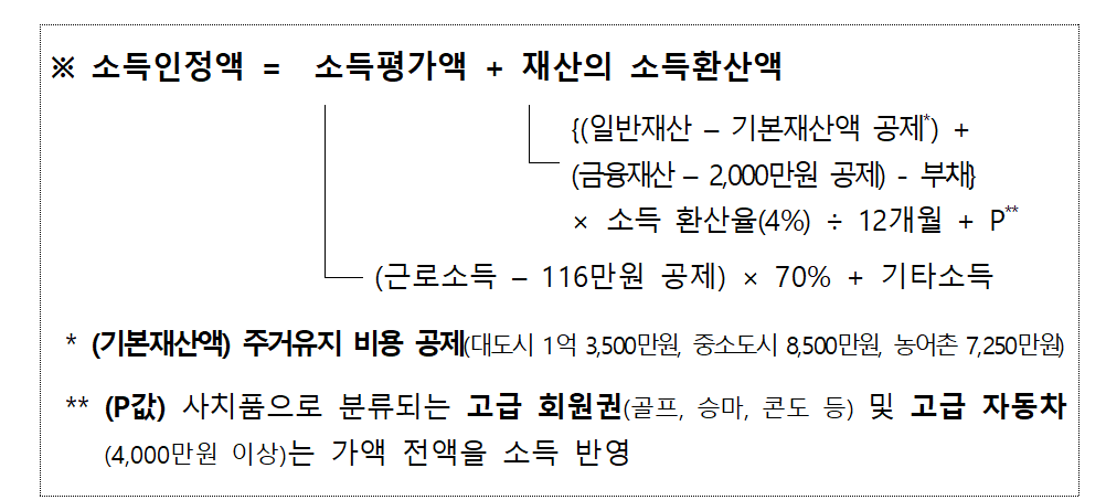- 소득평가액: 근로소득에서 116만 원 공제 후 70% 반영 + 기타소득