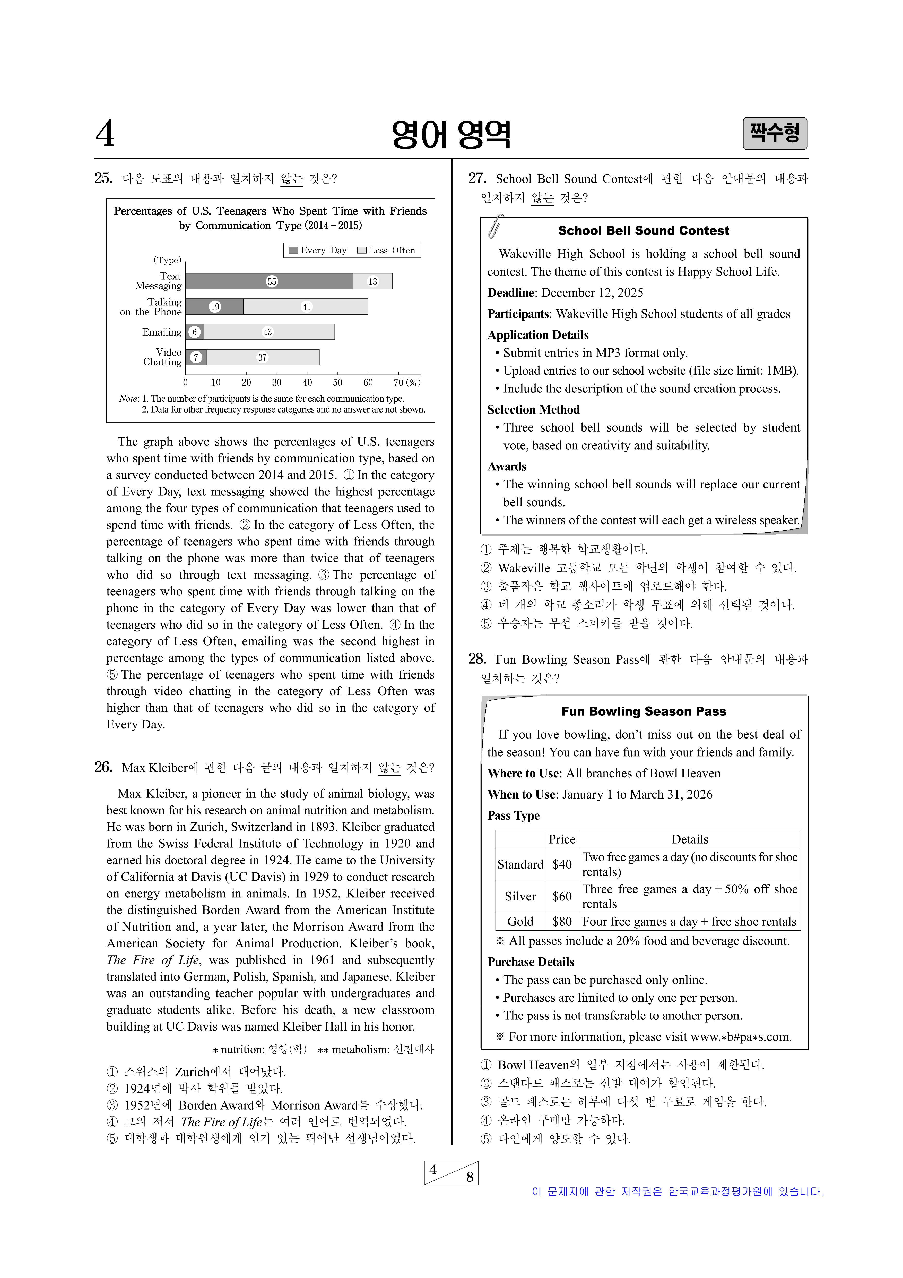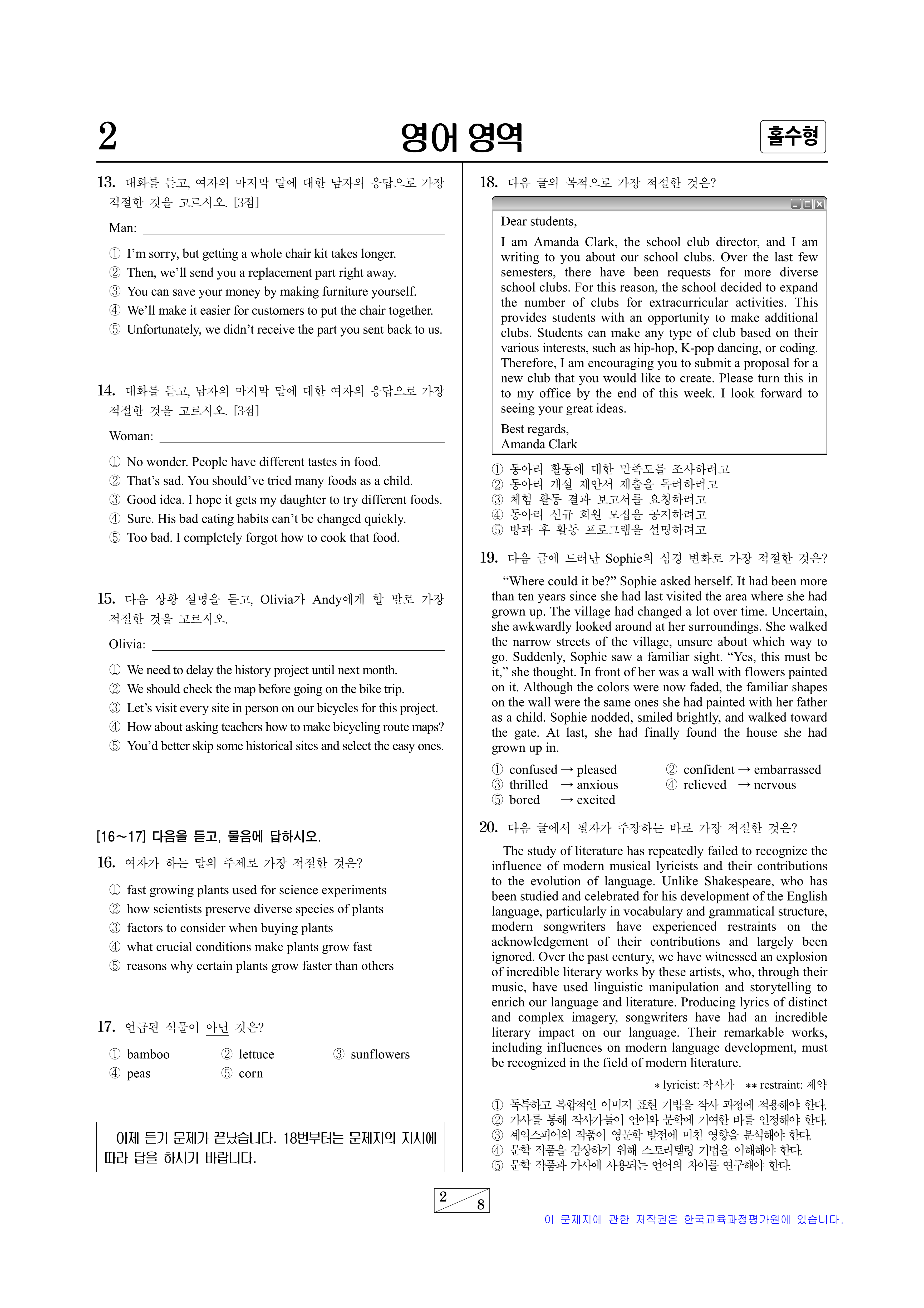 - 읽기·쓰기 영역: 13문항 → 지문, 안내문, 도표 활용