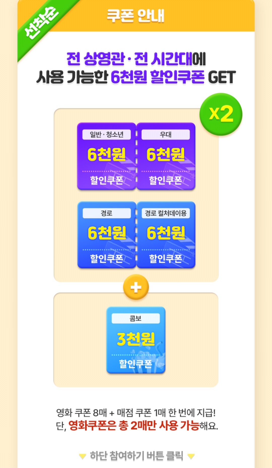 - 중복 할인 가능: ‘문화가 있는 날’ 할인(매달 마지막 수요일, 7천원)과 중복 적용 시 1,000원 영화 관람 가능
