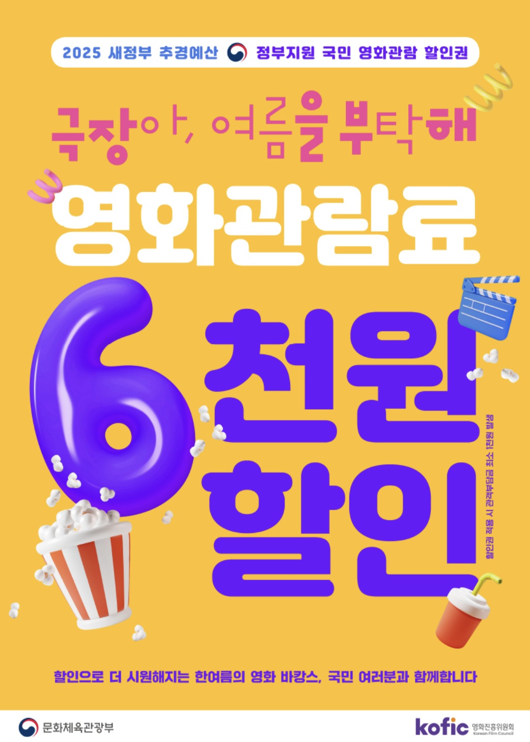 1. 여름, 영화 천원 관람 정책 개요무더운 여름, 영화 천원 관람 가능한 꿀혜택 소식입니다!문화체육관광부와 영화진흥위원회가 2025년 7월 25일(금) 오전 10시부터 선착순 발급하는 6,000원 할인권